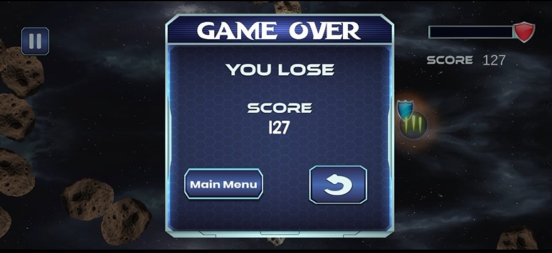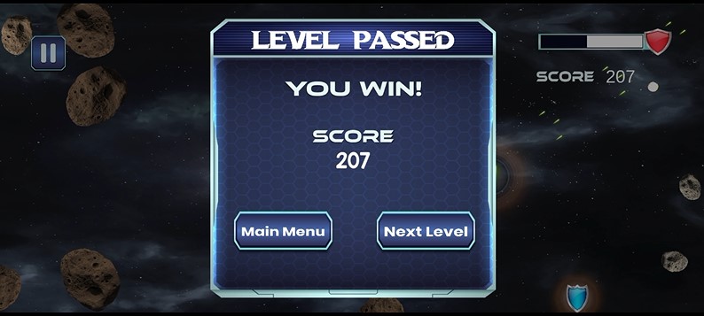 - Level Selection: Players can choose from levels with varying asteroid sizes and difficulties.